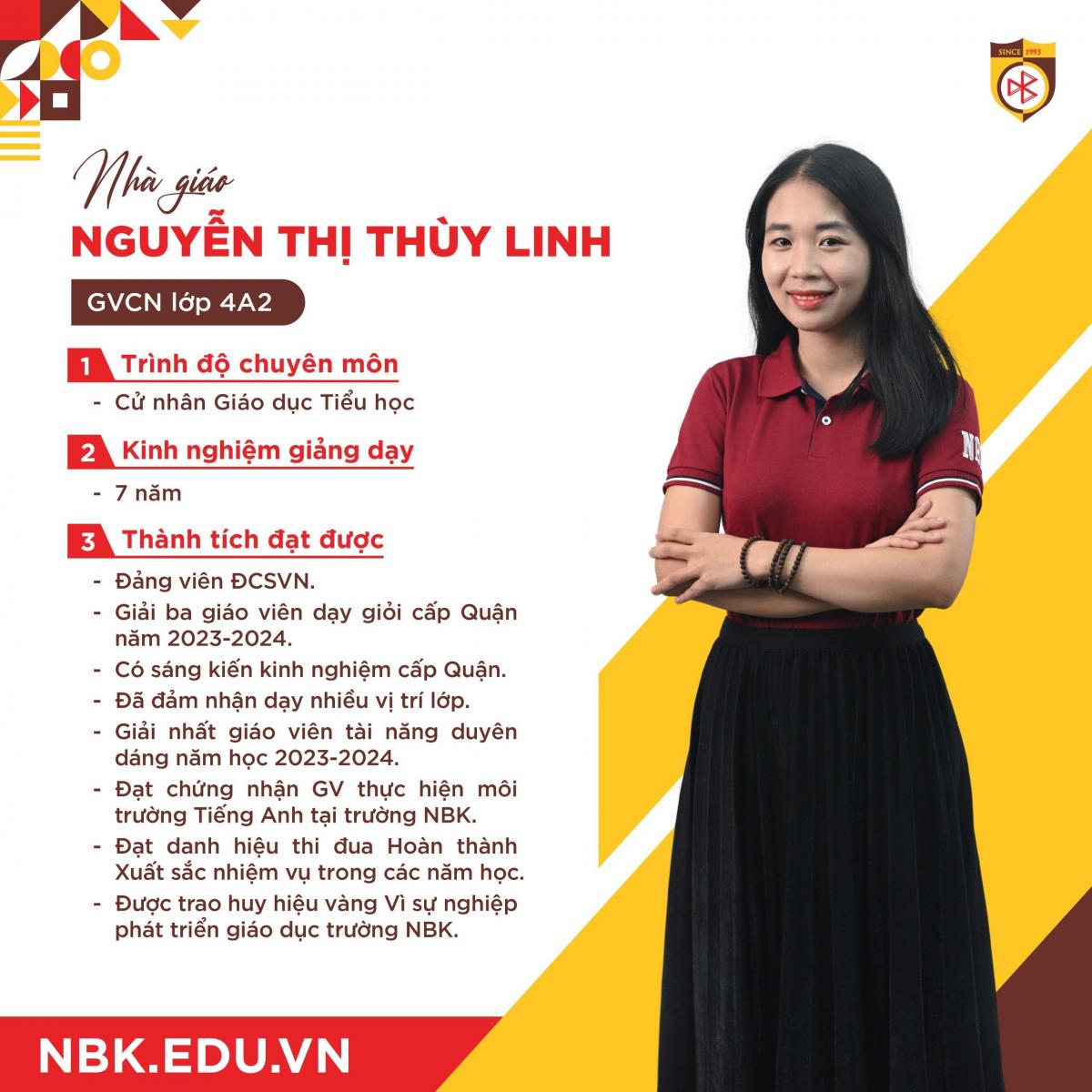 Cô Nguyễn Thị Thùy Linh là giáo viên trẻ, năng nổ, nhiệt tình, luôn đổi mới, sáng tạo trong cách giáo dục. Lớp do cô Linh chủ nhiệm luôn đạt lớp Tiên tiến - Xuất sắc, học sinh có nề nếp kỉ luật tốt. Cô luôn tiếp cận nhiều phương pháp giáo dục mới, hiện đại nhằm tạo môi trường giáo dục thân thiện, học sinh đều hạnh phúc khi đến trường.
