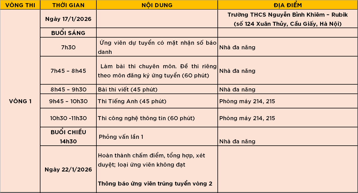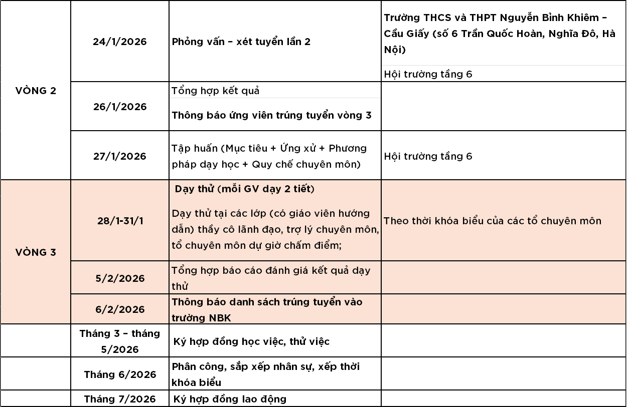 Trường NBK xin thông báo lịch thi tuyển giáo viên năm học 2026 - 2027 (chi tiết theo bảng bên dưới).