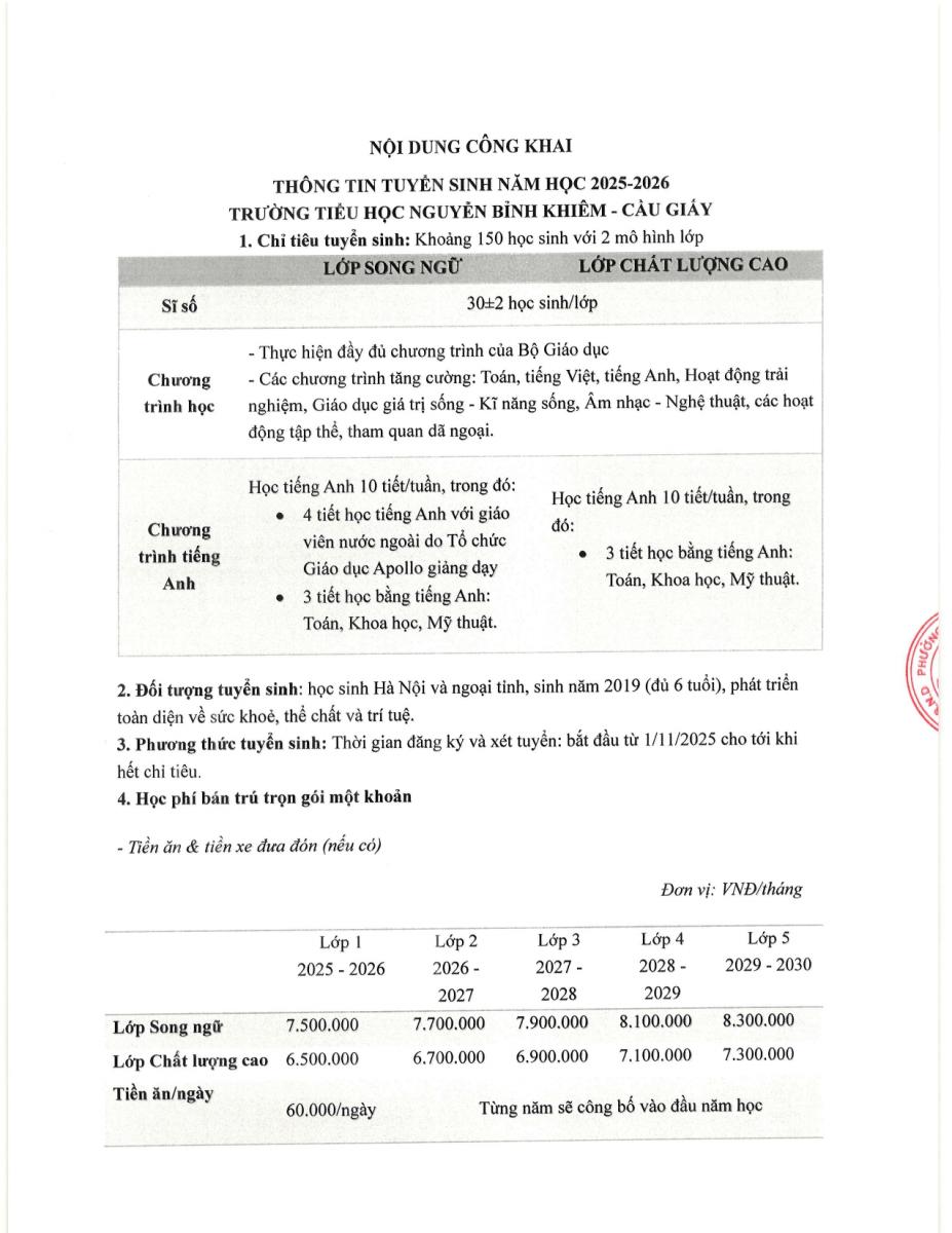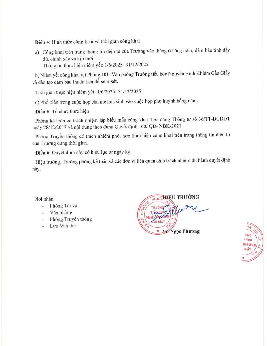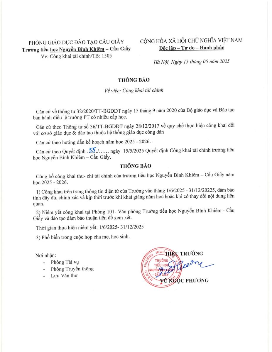 Trường Tiểu học Nguyễn Bỉnh Khiêm - Cầu Giấy thông báo công khai tài chính năm học 2025 - 2026